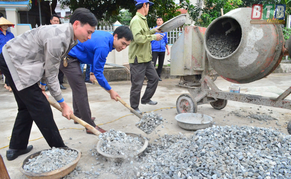 Đoàn viên thanh niên tham gia hoàn thành sân chơi cho thanh thiếu niên tại thôn Thọ Hưng, xã Minh Châu (Đông Hưng).