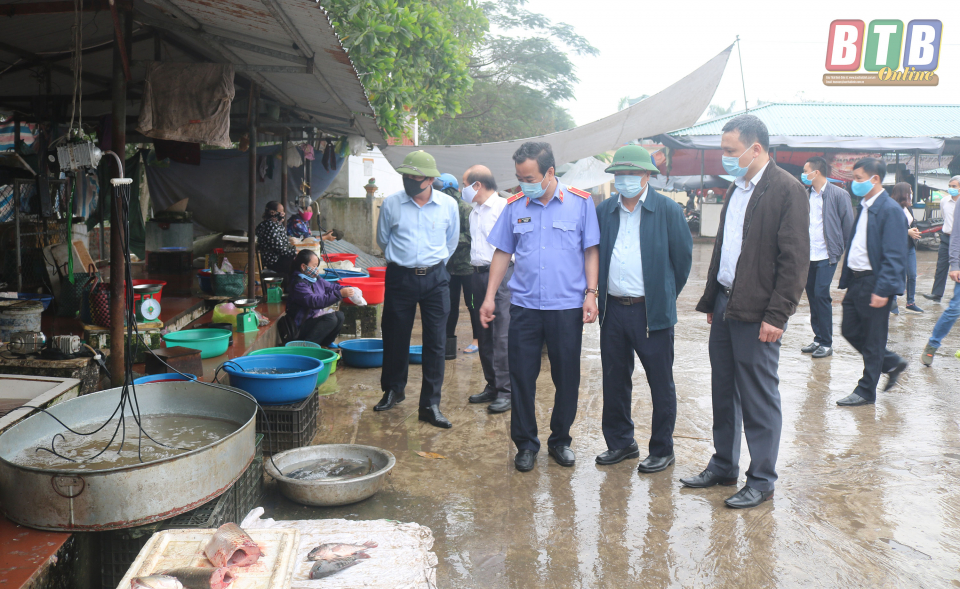 Đồng chí Nguyễn Quang Hưng, Tỉnh uỷ viên, Phó Chủ tịch UBND tỉnh cùng các thành viên trong đoàn kiểm tra, chỉ đạo công tác phòng, chống dịch Covid-19 tại chợ đầu mối phường Hoàng Diệu, thành phố Thái Bình.