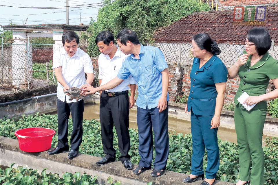 Đồng chí Nguyễn Tiến Thành, Phó Bí thư Tỉnh ủy thăm mô hình nuôi ba ba tại xã An Bình (Kiến Xương).