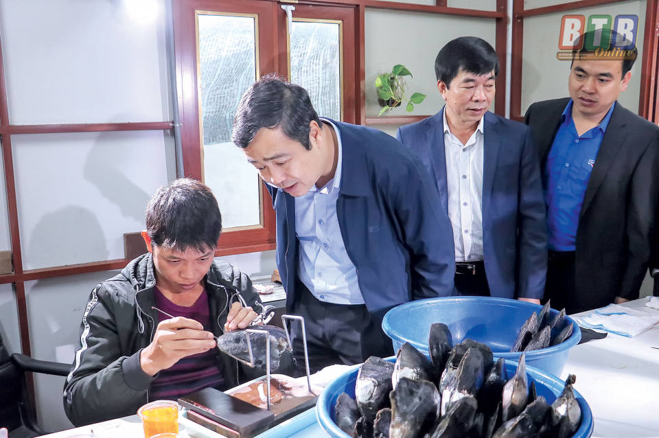 Đồng chí Ngô Đông Hải, Ủy viên dự khuyết Trung ương Đảng, Phó Bí thư thường trực Tỉnh ủy thăm mô hình nuôi trai lấy ngọc của thanh niên xã Đông Hoàng (Tiền Hải).