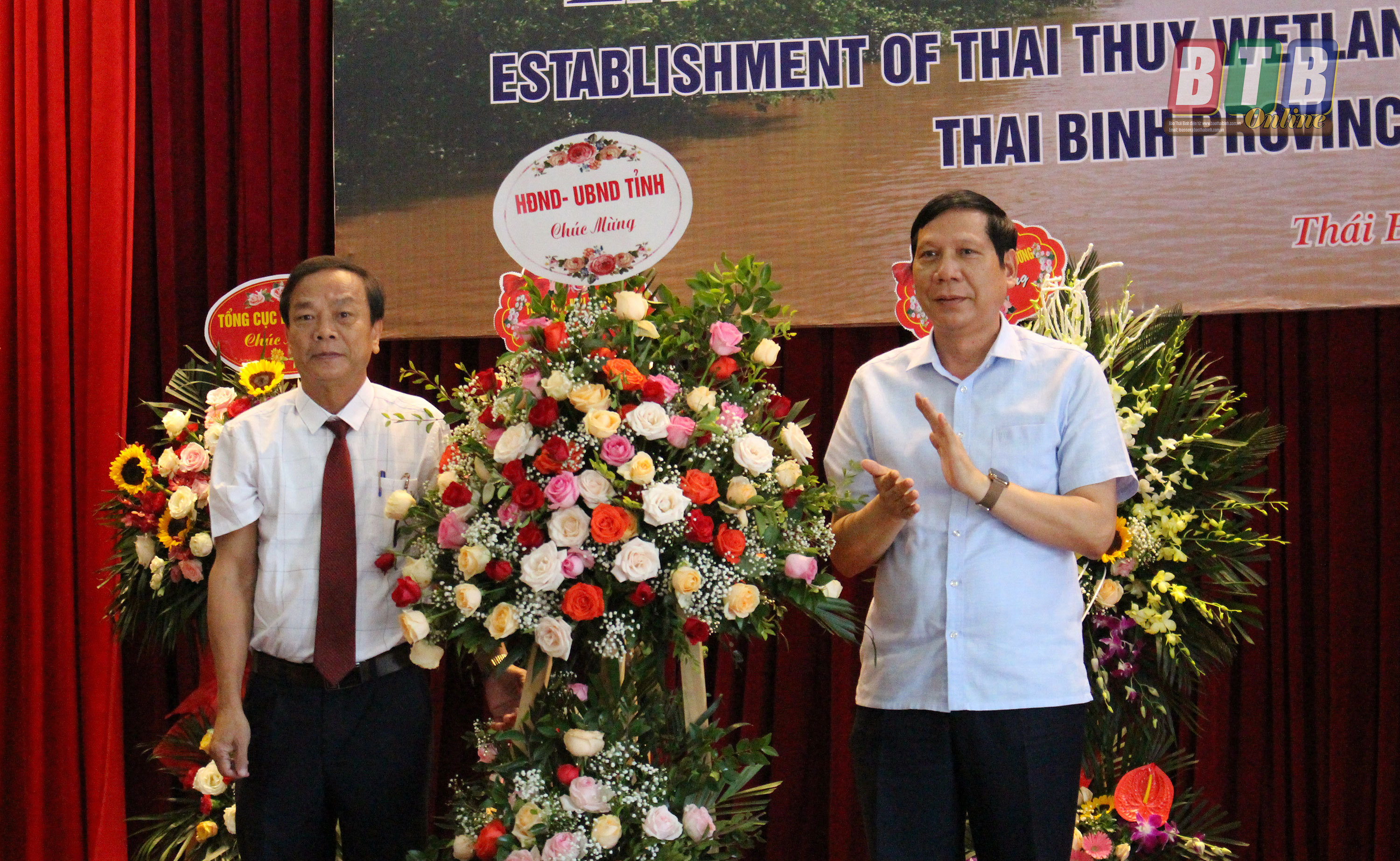 Phát biểu tại buổi lễ, đồng chí Võ Tuấn Nhân, Thứ trưởng Bộ Tài nguyên và Môi trường đánh giá việc thành lập Khu bảo tồn thiên nhiên Đất ngập nước Thái Thụy thể hiện sự quyết tâm của Đảng bộ, chính quyền tỉnh và nguyện vọng của nhân dân, thực thi Nghị quyết số 24-NQ/TW của Ban Chấp hành Trung ương (khóa XI) về chủ động ứng phó với biến đổi khí hậu, tăng cường quản lý tài nguyên và bảo vệ môi trường; Nghị quyết số 36-NQ/TW của Ban Chấp hành Trung ương (khóa XII) về Chiến lược phát triển bền vững kinh tế biển Việt Nam đến năm 2030, tầm nhìn đến năm 2045; Quyết định số 45/QĐ-TTg, ngày 8/1/2014 về phê duyệt quy hoạch tổng thể bảo tồn đa dạng sinh học cả nước đến 2020, tầm nhìn đến năm 2030. Đồng chí Thứ trưởng Bộ Tài nguyên và Môi trường chúc mừng tỉnh Thái Bình đã có thêm một khu vực được công nhận là khu bảo tồn thiên nhiên đất ngập nước.