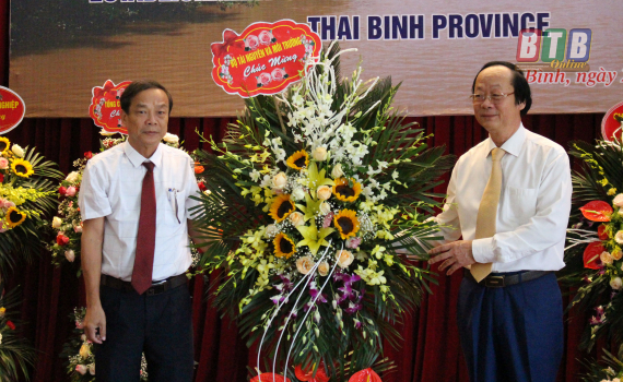 Đồng chí Vũ Mạnh Hiền, Tỉnh ủy viên, Phó Chủ tịch HĐND tỉnh thay mặt lãnh đạo HĐND, UBND tỉnh tặng hoa chúc mừng Ban Quản lý Khu bảo tồn thiên nhiên Đất ngập nước Thái Bình.