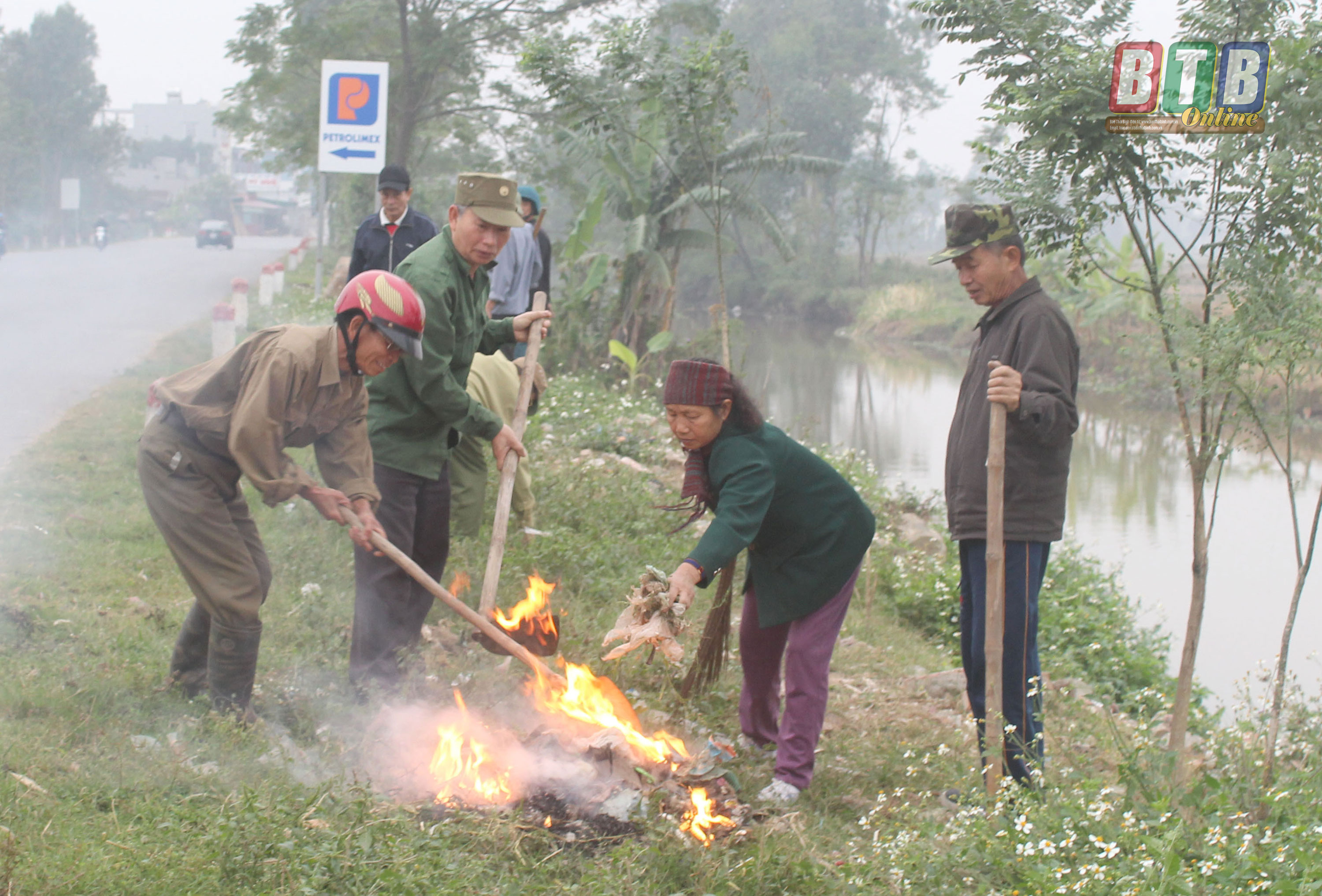 Người cao tuổi xã Phong Châu (Đông Hưng) tham gia dọn vệ sinh môi trường trên quốc lộ 39 chạy qua địa bàn xã.