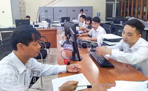Cán bộ Sở Tài nguyên và Môi trường hướng dẫn người dân làm thủ tục tại Trung tâm Phục vụ hành chính công tỉnh.