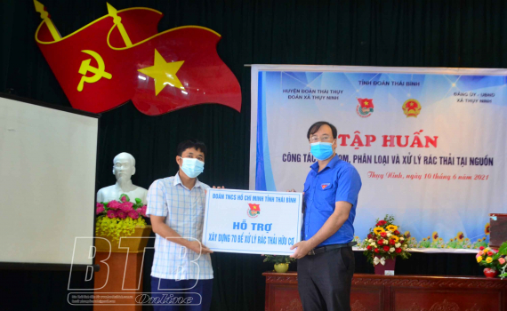 Nhân dịp này, lãnh đạo Tỉnh đoàn đã trao biển hỗ trợ xây dựng 70 bể xử lý rác thải hữu cơ cho xã Thụy Ninh.
