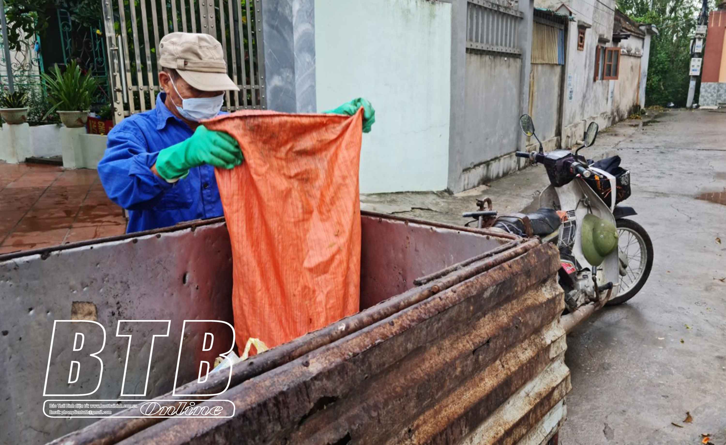 Dù ngày nắng hay mưa ông Hoàng Văn Tạo, Tổ thu gom rác thải thôn Nam Quán, xã Đông Các (Đông Hưng) vẫn cần mẫn với công việc.