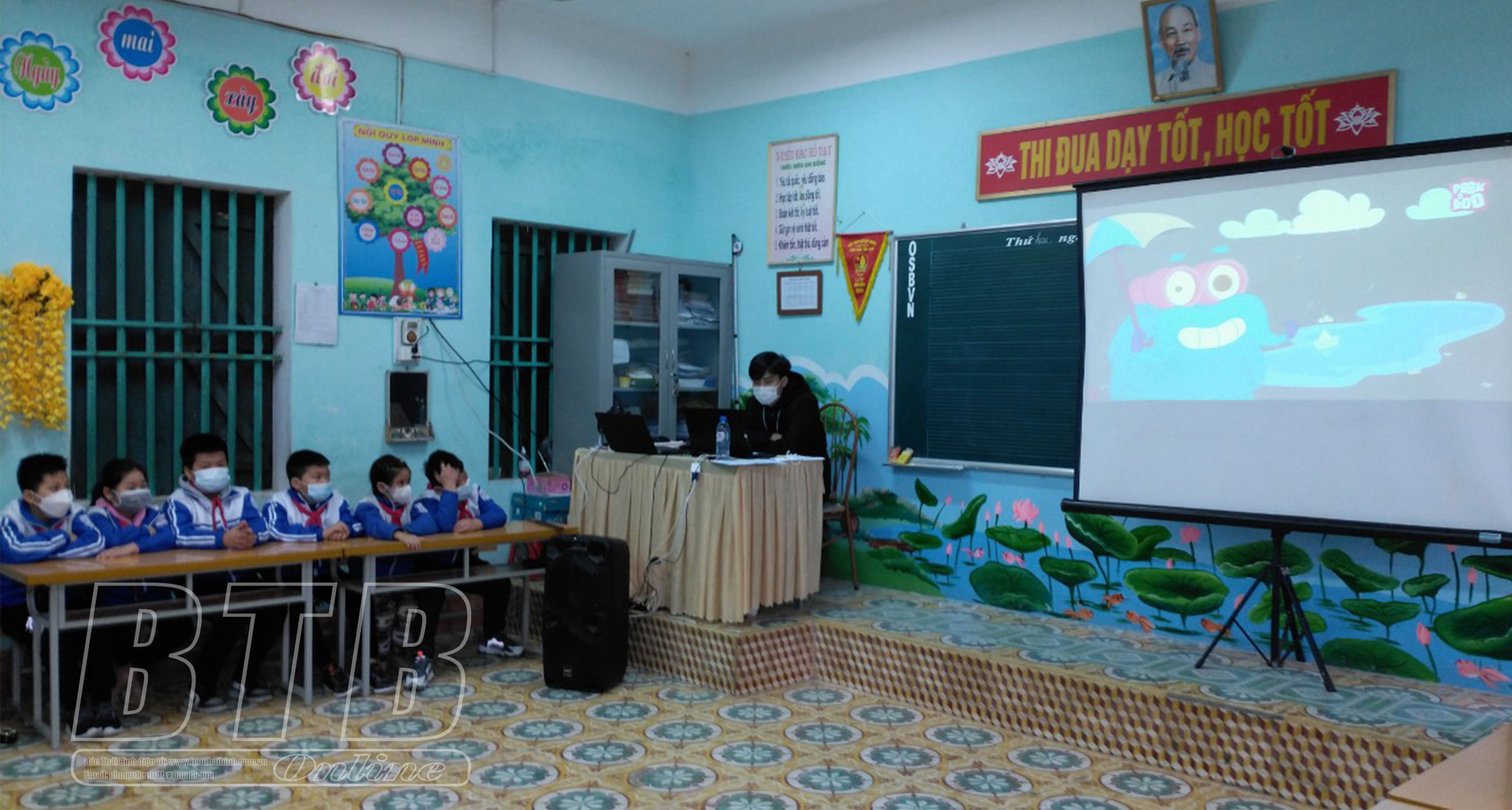 Các em học sinh xem phim hoạt hình giáo dục việc bảo vệ nguồn nước.