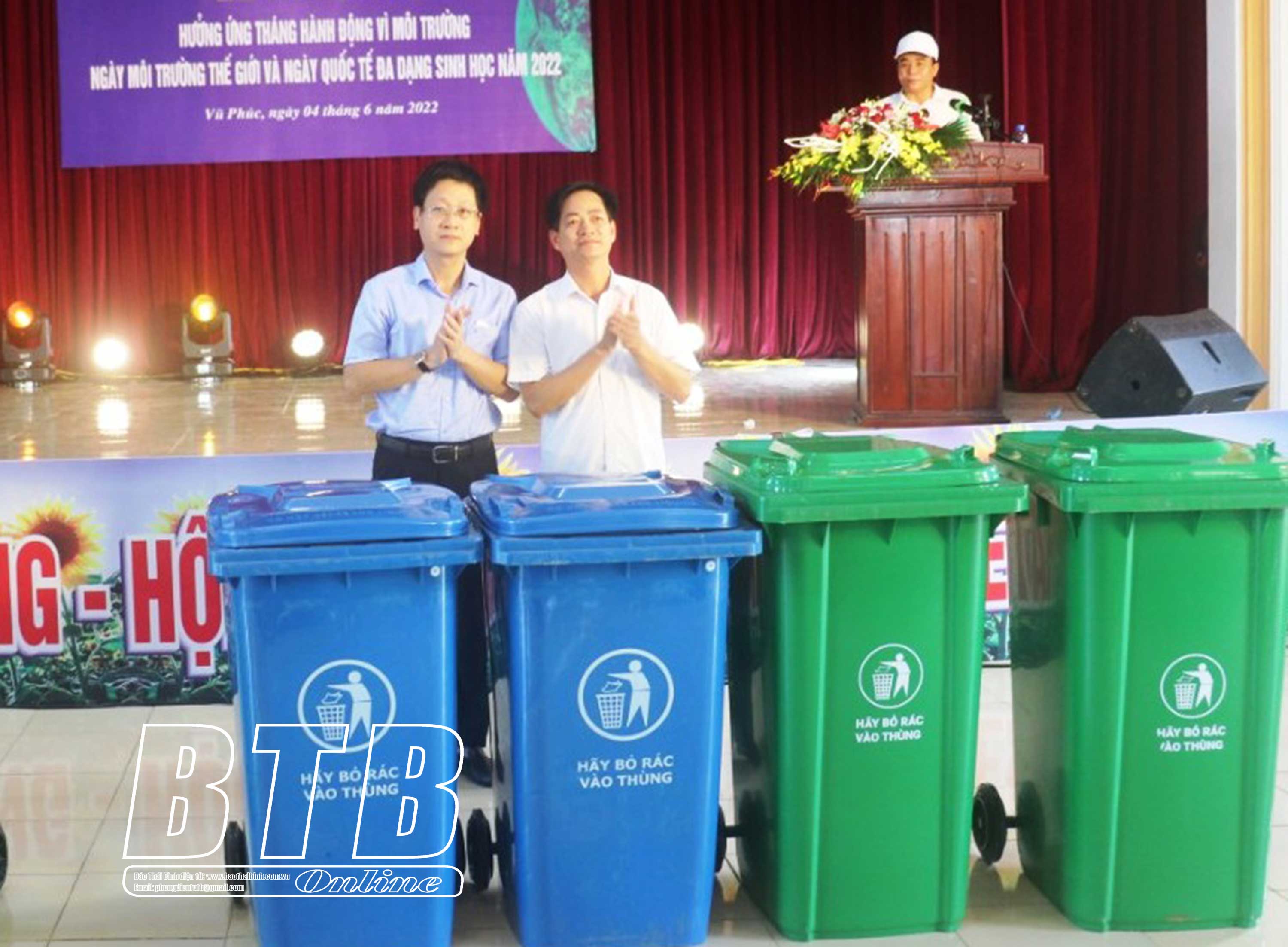 Lãnh đạo Sở Tài nguyên và Môi trường tặng thùng đựng rác cho xã Vũ Phúc.
