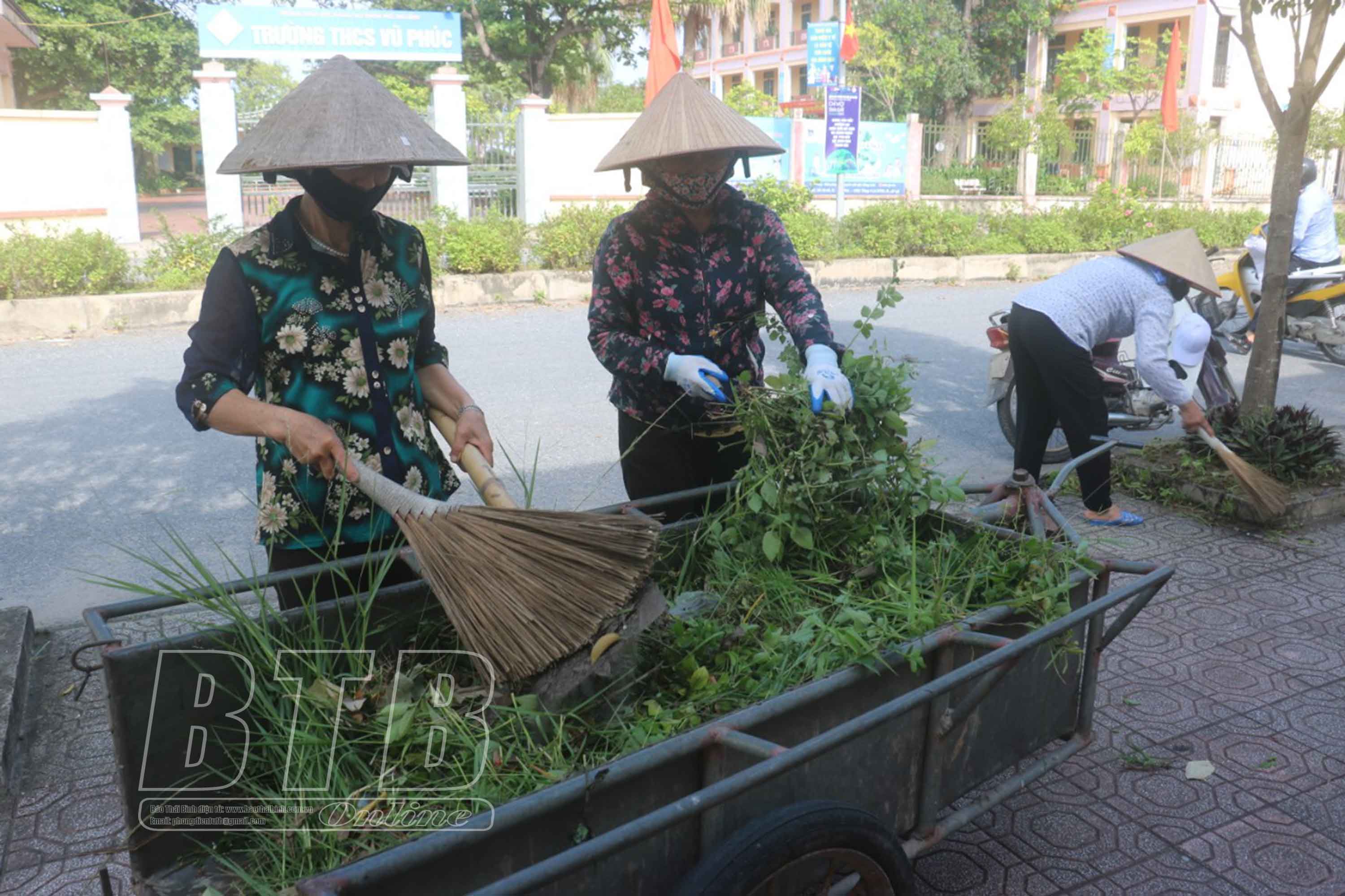 Cán bộ, hội viên phụ nữ xã Vũ Phúc (thành phố) tham gia dọn vệ sinh môi trường.
