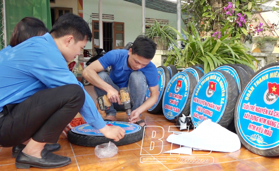 Vào những ngày cuối tuần, anh Nguyễn Văn Dũng, Bí thư Đoàn Thanh niên xã Song An cùng một số đoàn viên thanh niên tập trung tại trụ sở UBND xã để tạo ra “hành trình thứ hai” cho những chiếc lốp xe cũ. Một tháng qua, hàng chục chiếc lốp xe cũ đã được Đoàn Thanh niên xã thu gom, chế tạo thành các biển cảnh báo giao thông, thông điệp có ý nghĩa treo tại các trục đường chính, ngã ba, ngã tư.
