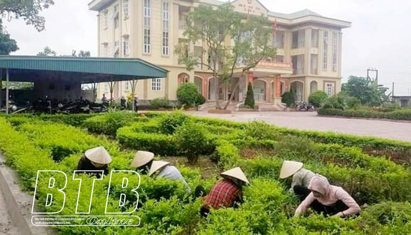 Cán bộ, hội viên phụ nữ xã Đông La làm đẹp cảnh quan tại UBND xã.