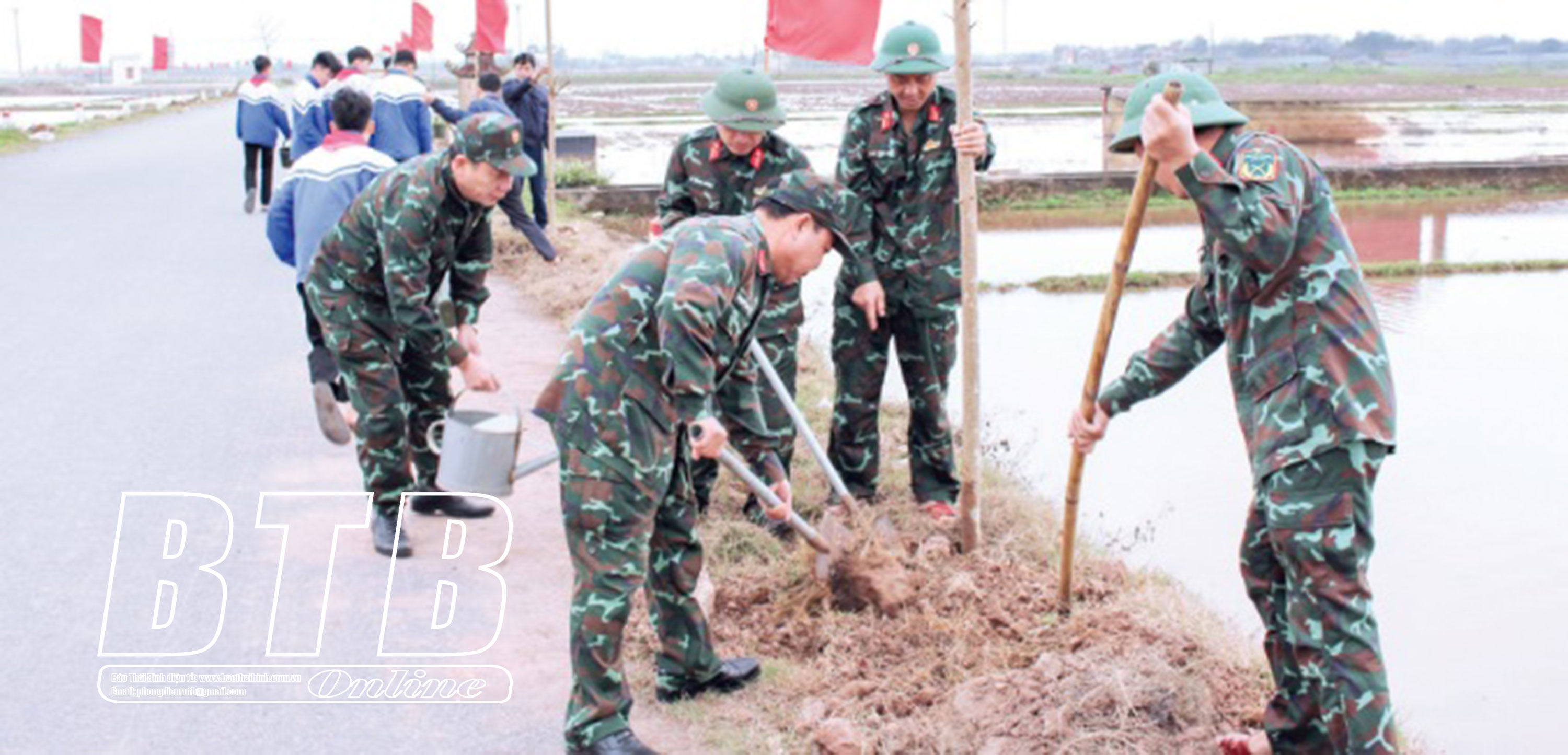 Cán bộ, chiến sĩ lực lượng vũ trang huyện Tiền Hải tham gia trồng cây.