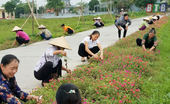 Phụ nữ xã Đông Động (Đông Hưng) trồng hoa làm đẹp cảnh quan thôn xóm.