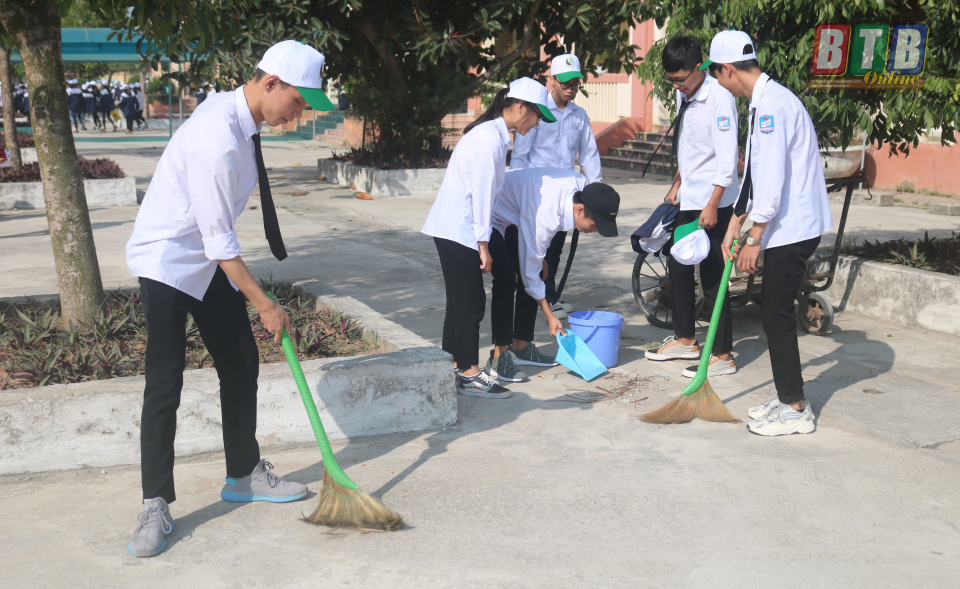 Học sinh Trường THPT Đông Thụy Anh tham gia dọn vệ sinh khuôn viên trường.