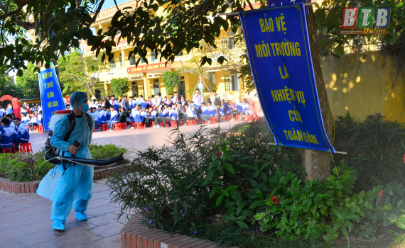 Sau lễ phát động, các đại biểu, thầy cô giáo và học sinh Trường THCS Kỳ Bá ra quân tổng vệ sinh môi trường, phun hóa chất khử khuẩn tại khu vực trường học và nơi công cộng trên địa bàn phường Kỳ Bá.