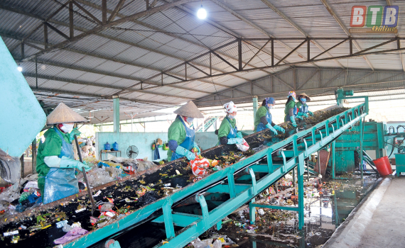 Dây chuyền phân loại rác của nhà máy xử lý rác thải sinh hoạt thị trấn Quỳnh Côi.