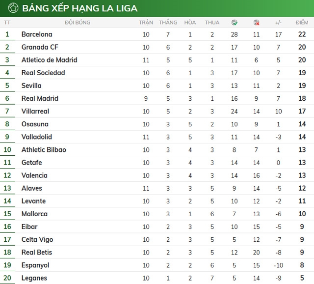 Với chiến thắng này, Barca tạm thời đòi lại ngôi đầu La Liga với 22 điểm. Trong khi đó ở một trận đấu đáng chú ý khác, Atletico bất ngờ để Alaves cầm hòa 1-1 nên chỉ có thể leo lên vị trí thứ ba nhưng bị Barca nới rộng khoảng cách thành 2 điểm cùng 1 trận thi đấu ít hơn.