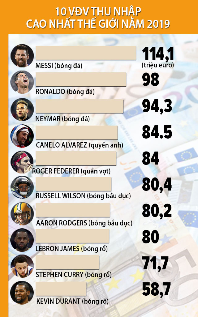 Bám sát Messi vẫn là đại kình địch Ronaldo, người có mức thu nhập 98 triệu euro. Một ngôi sao khác của bộ môn thể thao vua là tiền đạo người Brazil, Neymar đứng thứ 3 trong danh sách với khoản thu 94,3 triệu euro.