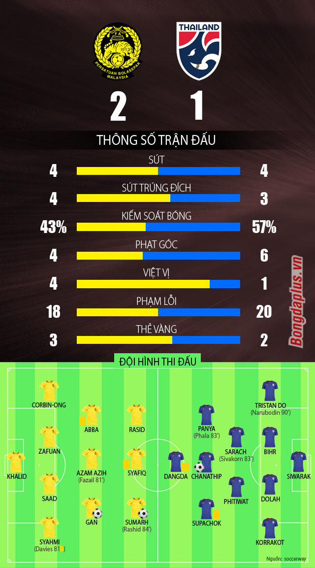 Những nỗ lực cuối cùng của Thái Lan cũng đã mang đến những cơ hội. Đáng kể nhất là cú volley của Supachok nhưng ở tình huống này thủ môn Khairul đã xuất sắc đổ người cản phá. Malaysia đã bảo vệ được tỷ số 2-1 và đây thực sự là một chiến thắng vô cùng xứng đáng của các học trò Tan Chang Hoe.