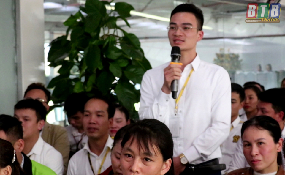 Người lao động Công ty Cổ phần Sản xuất hàng thể thao MXP tham gia đối thoại với ban lãnh đạo doanh nghiệp.