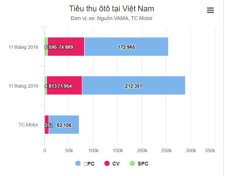 Doanh số lũy kế của thị trường đến tháng 11/2019 đạt 289.128 xe, chỉ tính xe con (PC), xe thương mại (CV) và xe chuyên dụng. Con số này tăng 14% so với cùng kỳ năm ngoái.