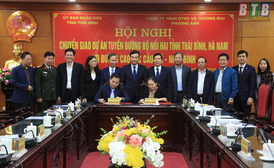 Dưới sự chứng kiến của các đại biểu dự hội nghị, đồng chí Nguyễn Hoàng Giang, Tỉnh ủy viên, Phó Chủ tịch thường trực UBND tỉnh và bà Hoàng Thị Phương, Tổng Giám đốc Công ty TNHH Đầu tư xây dựng và Thương mại Phương Anh đã ký biên bản chuyển giao dự án tuyến đường bộ nối hai tỉnh Thái Bình, Hà Nam với đường cao tốc cầu Giẽ - Ninh Bình.