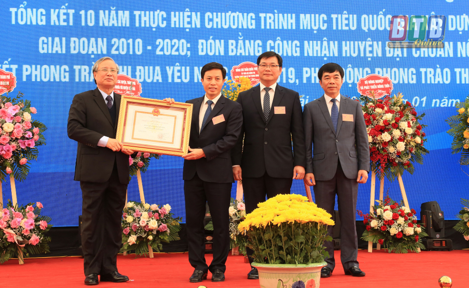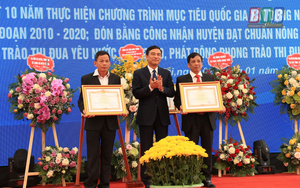 Tại buổi lễ, thừa uỷ quyền của Thủ tướng Chính phủ, đồng chí Đặng Trọng Thăng, Phó Bí thư Tỉnh ủy, Chủ tịch UBND tỉnh đã trao tặng bằng khen của Thủ tướng Chính phủ cho tập thể, cá nhân có thành tích xuất sắc trong phong trào xây dựng NTM. Đồng chí Nguyễn Khắc Thận, Tỉnh ủy viên, Phó Chủ tịch UBND tỉnh tặng bằng khen của Chủ tịch UBND tỉnh cho tập thể, cá nhân có thành tích xuất sắc trong phong trào xây dựng NTM.