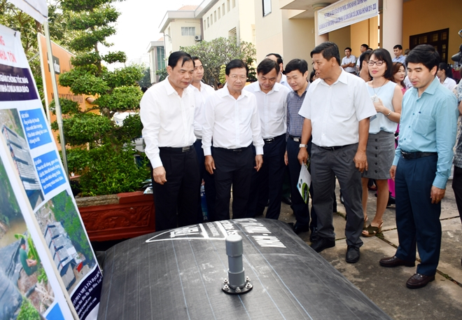 Phó Thủ tướng Trịnh Đình Dũng tham quan mô hình túi chứa nước ngọt của Công ty cổ phần nhựa Tân Đại Hưng