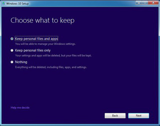 - Tiếp tục nhấn "Next" ở các bước sau, khi xuất hiện hộp thoại như hình minh họa dưới đây, bạn chọn "Keep personal files and apps" để giữ lại dữ liệu và các ứng dụng, phần mềm đã cài đặt trên Windows cũ sau khi đã nâng cấp lên Windows 10. Nhấn "Next" để tiếp tục.