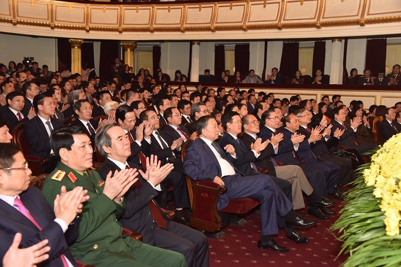 Cùng dự, có các đồng chí: nguyên Tổng Bí thư Nông Ðức Mạnh; nguyên Chủ tịch Quốc hội Nguyễn Sinh Hùng; Trần Quốc Vượng, Ủy viên Bộ Chính trị, Thường trực Ban Bí thư; các đồng chí Ủy viên Bộ Chính trị, Bí thư T.Ư Ðảng: Phạm Minh Chính, Trưởng Ban Tổ chức T.Ư; Trương Thị Mai, Trưởng Ban Dân vận T.Ư; Võ Văn Thưởng, Trưởng Ban Tuyên giáo T.Ư; Nguyễn Văn Bình, Trưởng Ban Kinh tế T.Ư; các đồng chí nguyên Ủy viên Bộ Chính trị, Bí thư T.Ư Ðảng: Tô Huy Rứa, nguyên Trưởng Ban Tổ chức T.Ư; Ngô Văn Dụ, nguyên Chủ nhiệm Ủy ban Kiểm tra T.Ư; Vũ Oanh, nguyên Trưởng Ban Dân vận T.Ư; các đồng chí Ủy viên Bộ Chính trị: Vương Đình Huệ, Phó Thủ tướng Chính phủ; Đại tướng Tô Lâm, Bộ trưởng Công an; các đồng chí Bí thư T.Ư Đảng: Nguyễn Hòa Bình, Chánh án Tòa án Nhân dân tối cao; Nguyễn Xuân Thắng, Giám đốc Học viện Chính trị Quốc gia Hồ Chí Minh, Chủ tịch Hội đồng Lý luận T.Ư; Đại tướng Lương Cường, Chủ nhiệm Tổng cục Chính trị, cùng các đồng chí Ủy viên T.Ư Ðảng, đại diện lãnh đạo các ban, bộ, ngành, cơ quan T.Ư và các tác giả có tác phẩm nhận giải.