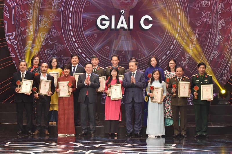 Các Ủy viên Bộ Chính trị: Phó Thủ tướng Chính phủ Vương Đình Huệ, Đại tướng - Bộ trưởng Công an Tô Lâm trao giải C cho các tác giả, nhóm tác giả đoạt giải.