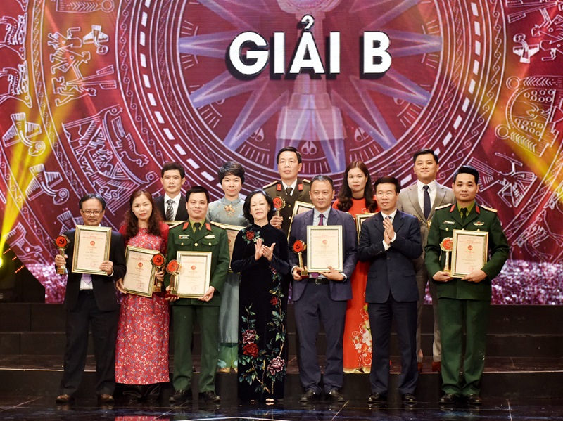 Các Ủy viên Bộ Chính trị, Bí thư Trung ương Đảng: Trưởng ban Tuyên giáo Trung ương Võ Văn Thưởng, Trưởng ban Dân vận Trung ương Trương Thị Mai trao giải B cho các tác giả, nhóm tác giả đoạt giải.