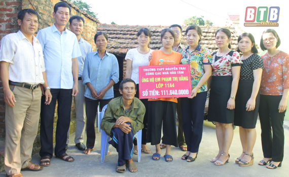 Tại gia đình Hằng, Ban giám hiệu Trường THPT Nguyễn Trãi cùng các thầy cô giáo, bạn bè đã thăm hỏi, động viên và trao cho em tổng số tiền 111.640.000 đồng. Đây là số tiền do Đoàn Thanh niên Cộng sản Hồ Chí Minh Trường THPT Nguyễn Trãi đã kêu gọi, vận động các thầy cô giáo, học sinh, cựu học sinh của Trường và các nhà hảo tâm quyên góp, ủng hộ nhằm hỗ trợ kinh phí giúp đỡ Hằng điều trị bệnh và gia đình vơi bớt khó khăn trong cuộc sống.