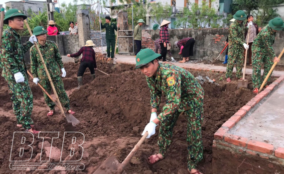 Cán bộ, chiến sĩ Đồn Biên phòng Cửa Lân hỗ trợ ngày công xây dựng nhà cho em Tống Thị Huê, thôn Đồng Châu, xã Đông Minh (Tiền Hải).