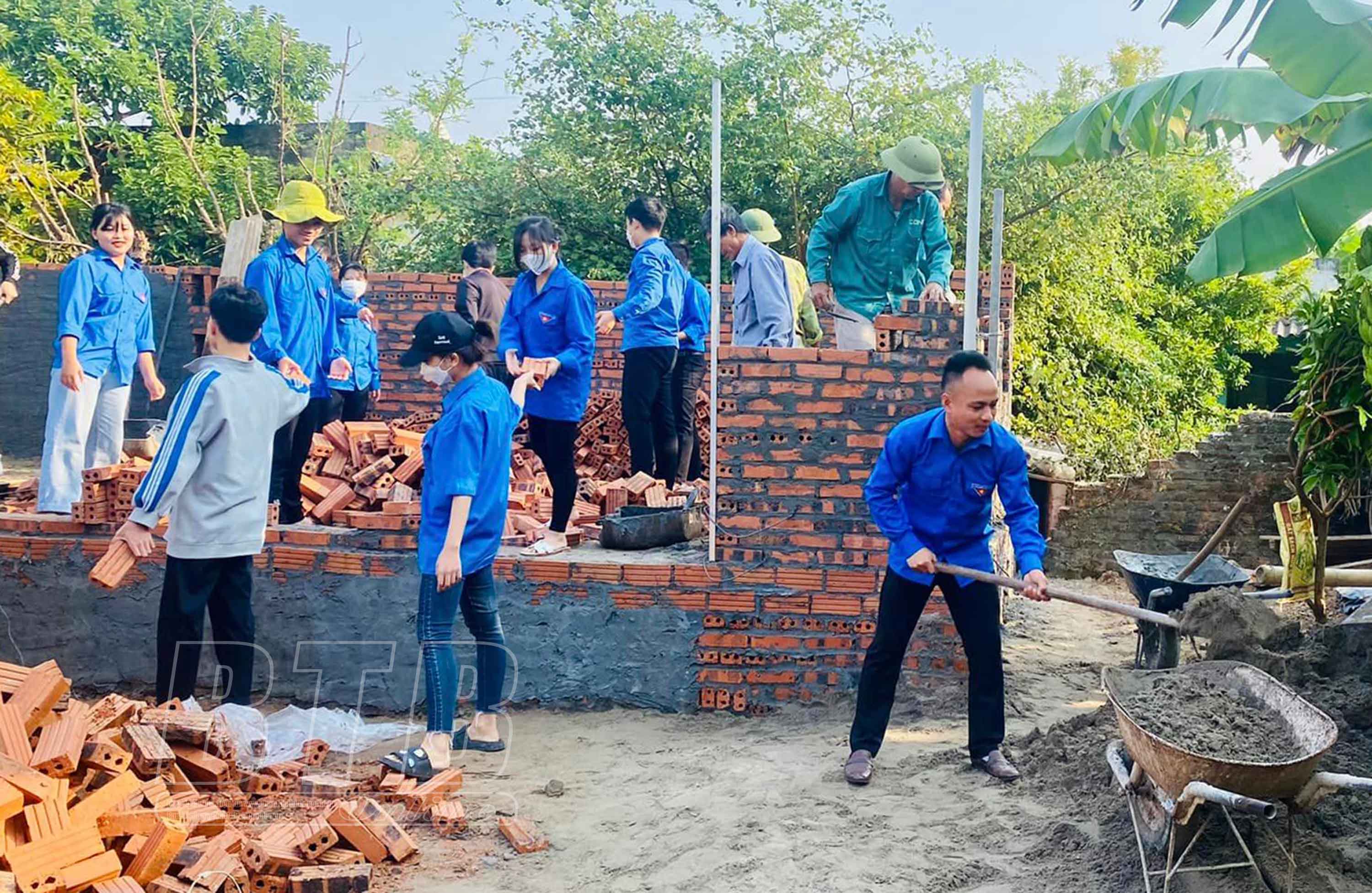 Cán bộ, đoàn viên, thanh niên hỗ trợ xây nhà cho mẹ con em Tâm.
