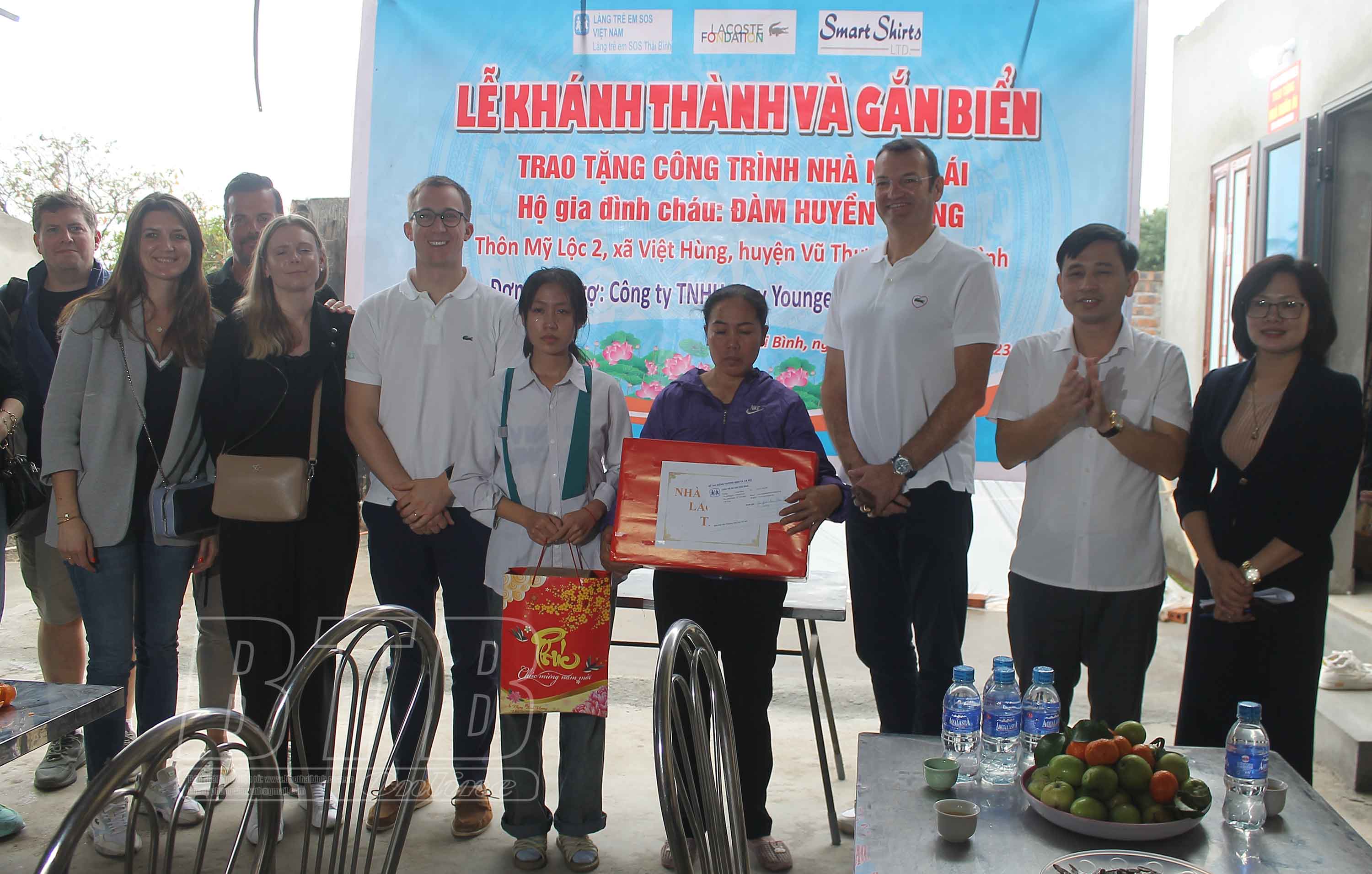Đại diện Công ty TNHH May Younger Smart Shirts trao kinh phí hỗ trợ xây nhà; lãnh đạo Làng trẻ em SOS Thái Bình trao quà cho gia đình cháu Đàm Huyền Trang.