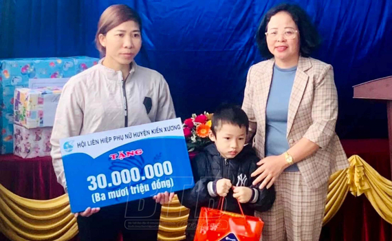 Hội LHPN huyện Kiến Xương trao kinh phí hỗ trợ xây dựng nhà Mái ấm tình thương tặng gia đình chị Nguyễn Thị Xiêm.