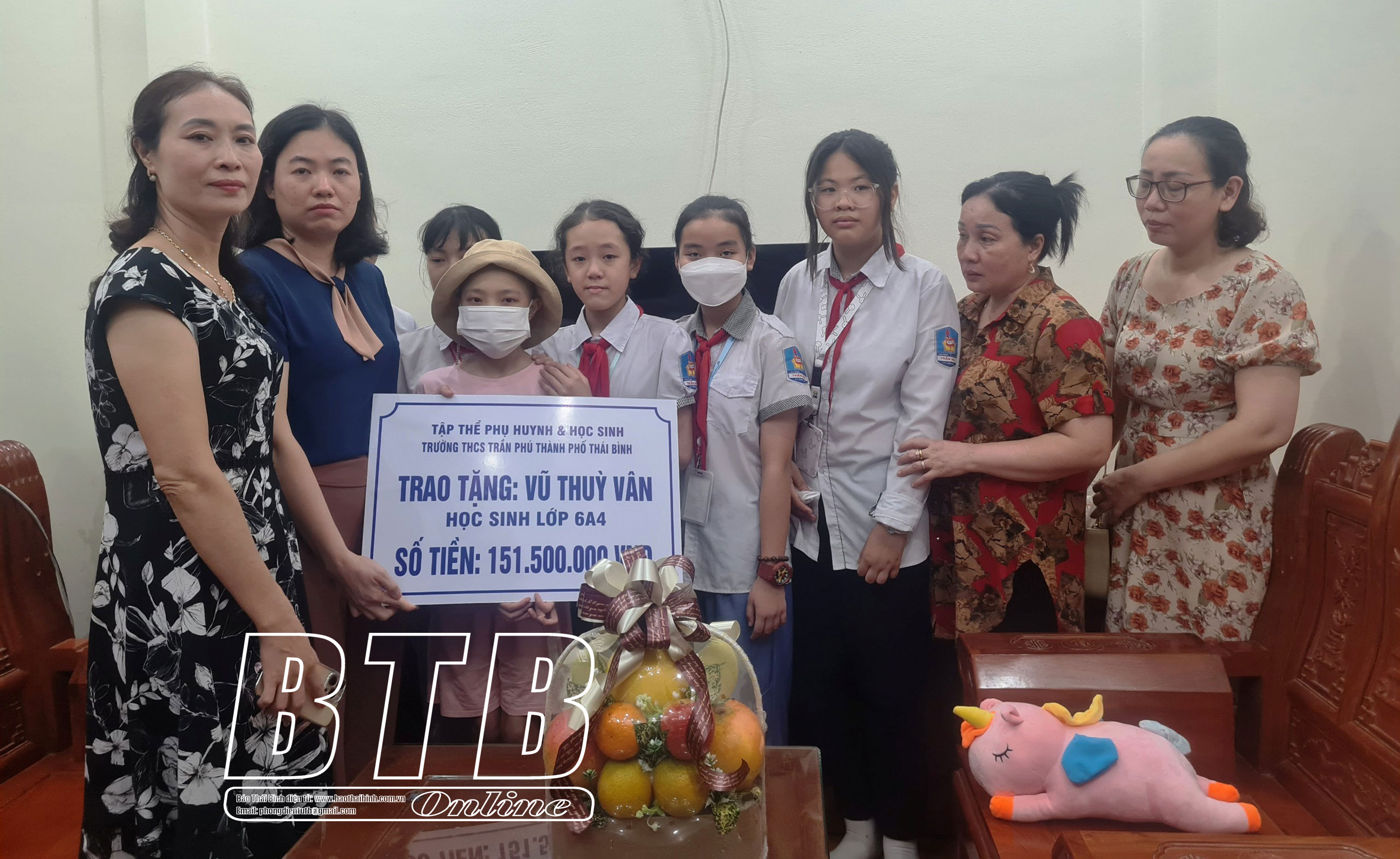 Chiều ngày 10/5, Trường THCS Trần Phú, thành phố Thái Bình đã đến thăm và trao tặng trên 180 triệu đồng cho học sinh Vũ Thùy Vân, lớp 6A4.