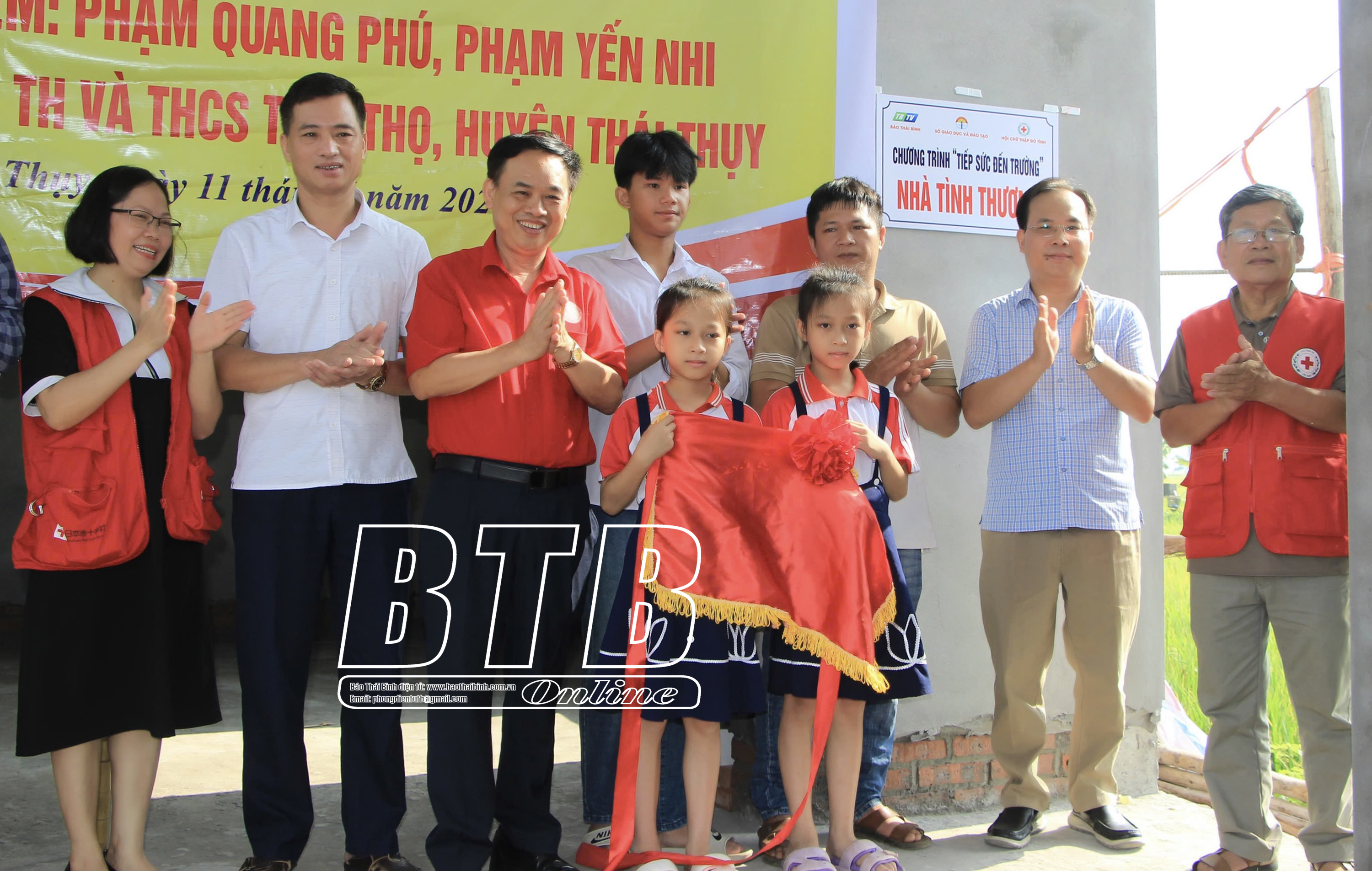 Đại diện chương trình “Tiếp sức đến trường” trao kinh phí hỗ trợ cho gia đình em Phạm Quang Phú, Phạm Quang Yến Ngọc và Phạm Quang Yến Nhi, ở thôn Độc Lập, xã Thái Thọ (Thái Thụy).