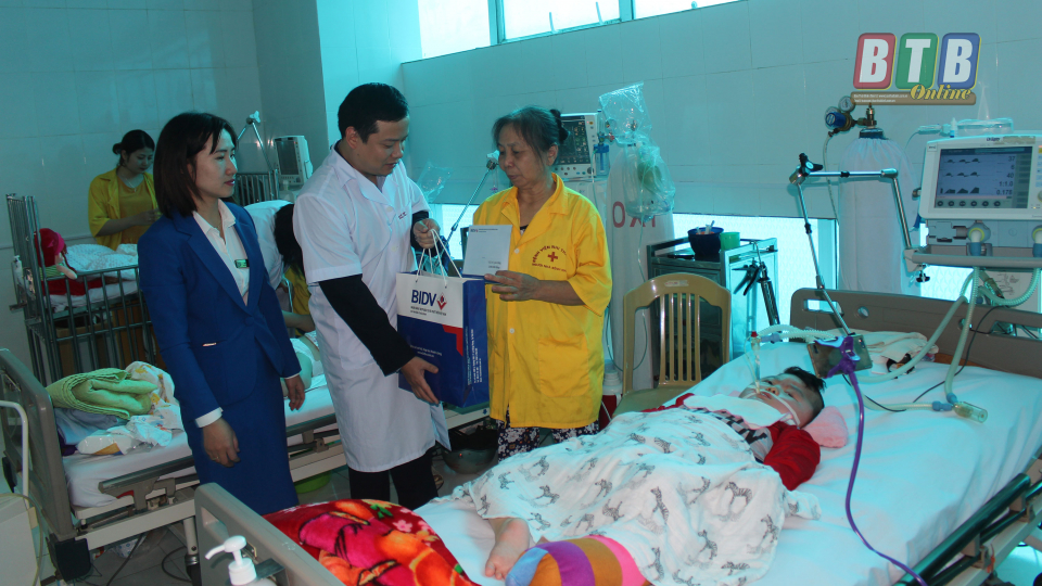 Đại diện BIDV Chi nhánh Thái Bình trao quà cho bệnh nhi nặng của Khoa Hồi sức tích cực (Bệnh viện Nhi Thái Bình).