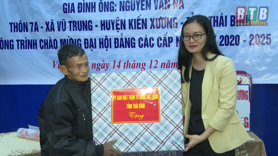 Tại buổi lễ các đồng chí lãnh đạo tỉnh, huyện Kiến Xương và các ban ngành đoàn thể đã tặng cho gia đình ông Hà các phần quà thiết thực. Đây là căn nhà thứ 5 do ban vận động quỹ vì người nghèo huyện khánh thành và bàn giao cho các hộ nghèo. Đây cũng là hoạt động thiết thực hưởng ứng phong trào thi đua hướng tới chào mừng đại hội đảng các cấp nhiệm kỳ 2020-2025.