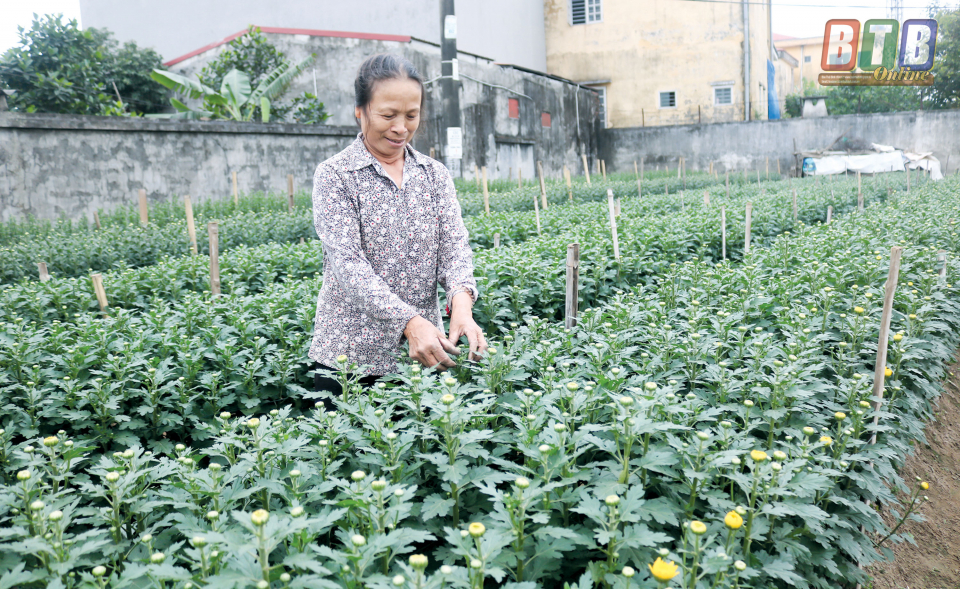 Tết năm nay với thương binh hạng 4/4 Nguyễn Đình Quế, thôn Tống Văn, xã Vũ Chính (thành phố Thái Bình) là năm thứ 23 gia đình ông trồng hoa để phục vụ người dân trong dịp tết. Năm nay, dù việc đi lại khó khăn do ông vừa nằm viện điều trị sau tai nạn nhưng không vì thế mà 3 sào hoa đang vào vụ thu hoạch bị chững lại. Những ngày giáp tết, vợ ông, bà Ngô Thị Tránh luôn có mặt từ sáng sớm cho đến chiều để phục vụ hoa tết cho thương lái và người dân ở khắp các địa phương. Thời tiết năm nay thuận lợi nên 3 sào hoa của gia đình với đủ loại: cúc vàng, cúc mâm xôi, thược dược, dạ yến thảo, sen cạn, cẩm chướng... đua nhau khoe sắc, được thương lái và người dân rất ưa thích. Tất bật giới thiệu hoa cho khách nhưng bà vẫn tươi cười khoe với chúng tôi: Mấy vườn hoa cúc này đã có khách đặt hết rồi, giờ chỉ còn vài luống hoa cúc mâm xôi, thược dược, sen cạn chờ người dân đến mua về chơi tết. Giá năm nay cũng không có nhiều biến động, nếu thời tiết thuận lợi, 3 sào trồng hoa trừ chi phí sẽ đem về cho gia đình tôi khoảng 60 triệu đồng.