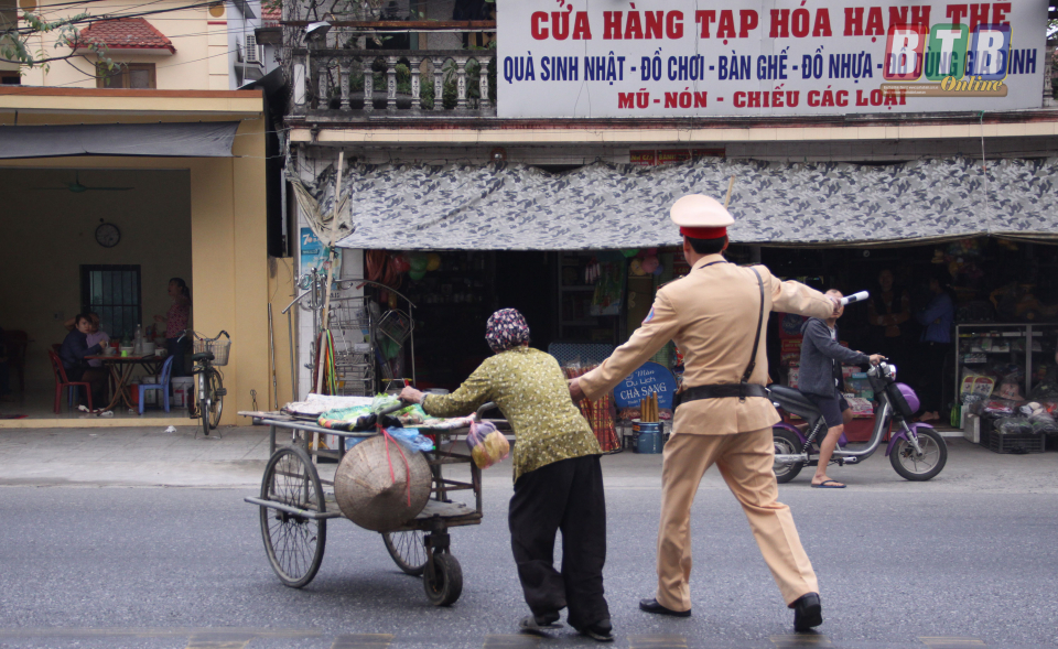 Lực lượng cảnh sát giao thông giúp đỡ người dân sang đường bảo đảm an toàn.