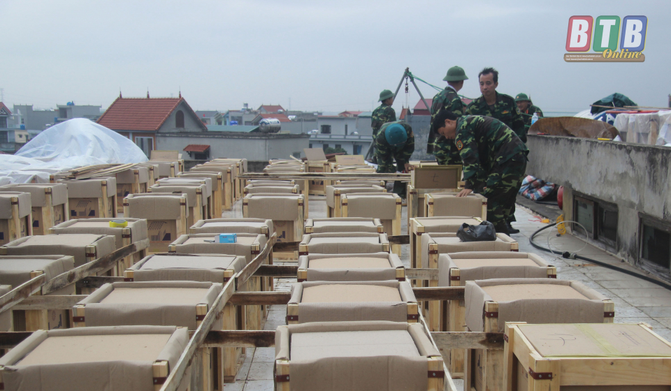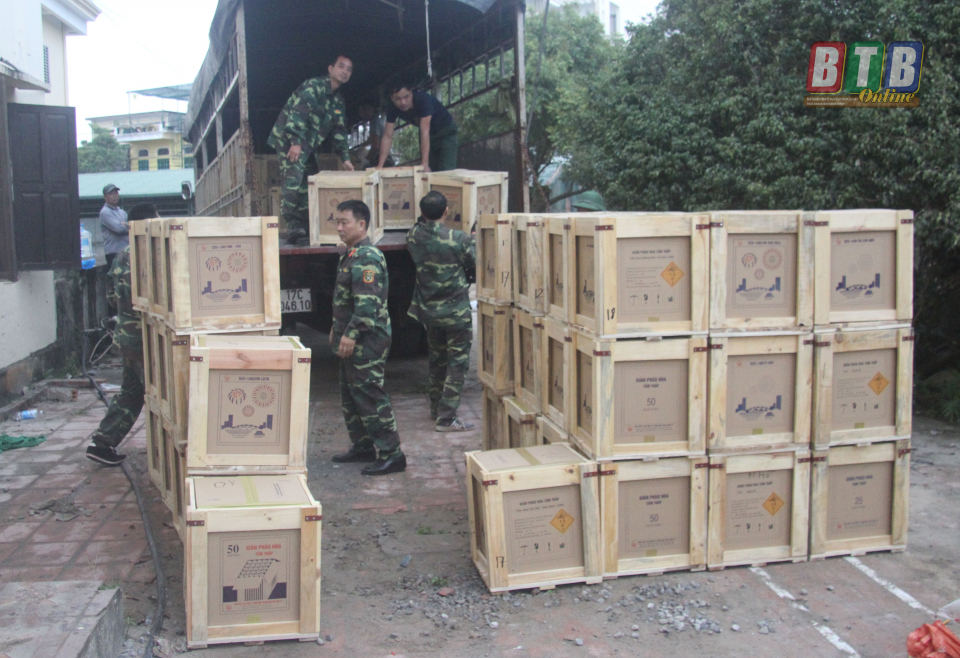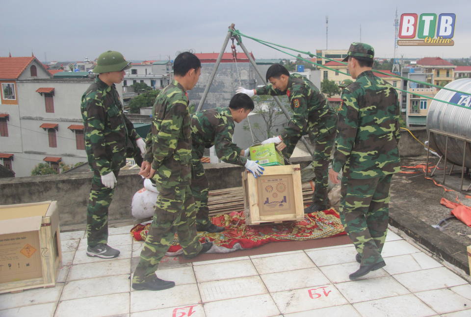 Cán bộ Ban Chỉ huy Quân sự huyện Tiền Hải tập kết dàn pháo hoa vào trận địa.