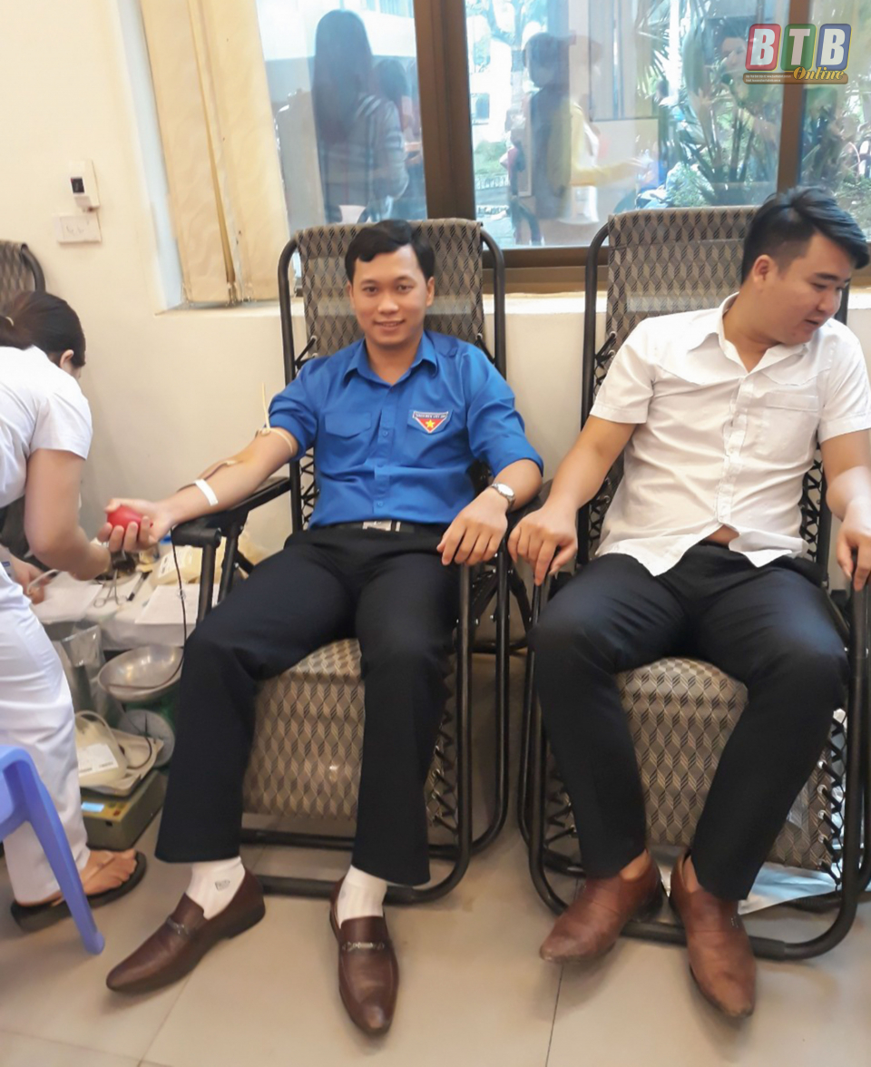 Anh Nguyễn Xuân Trường, Bí thư Đoàn Thanh niên thị trấn Hưng Hà (áo xanh) tham gia hiến máu tình nguyện.