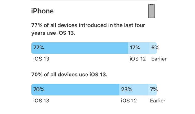 Tổng cộng có 70% tất cả các thiết bị iOS đang chạy iOS 13. Đây là con số thống kê với cả các đời iPhone cũ. 23% cài đặt iOS 12 và 7% dùng các các phiên bản iOS trước đó.