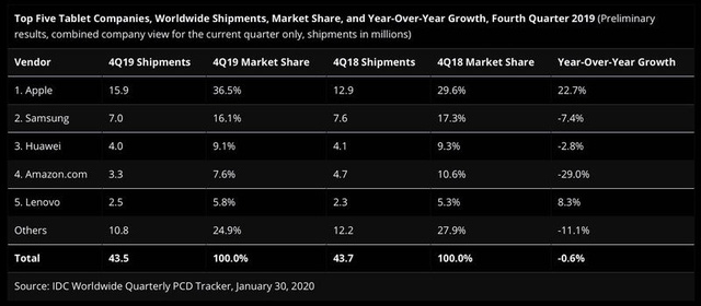 Thống kê từ IDC cho thấy trong quý IV/2019, Apple bán được 15,9 triệu chiếc iPad, tương đương mức tăng trưởng 22,7% so với cùng kỳ năm ngoái. Con số này tương đương với mức thị phần 36,5% của Apple tại thị trường máy tính bảng trong quý IV. Điều này đồng nghĩa với việc cứ 3 người mua máy tính bảng thì có hơn 1 người sắm cho mình iPad.