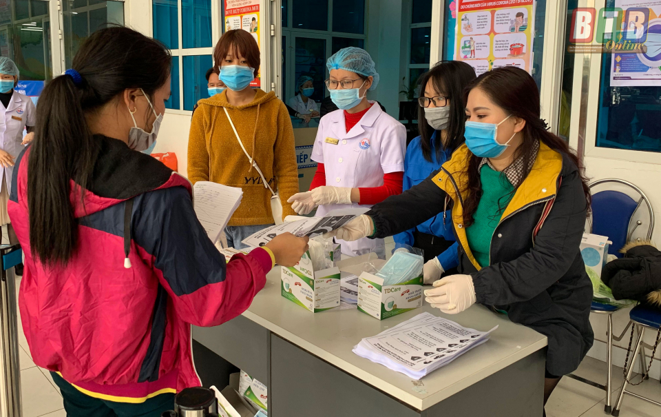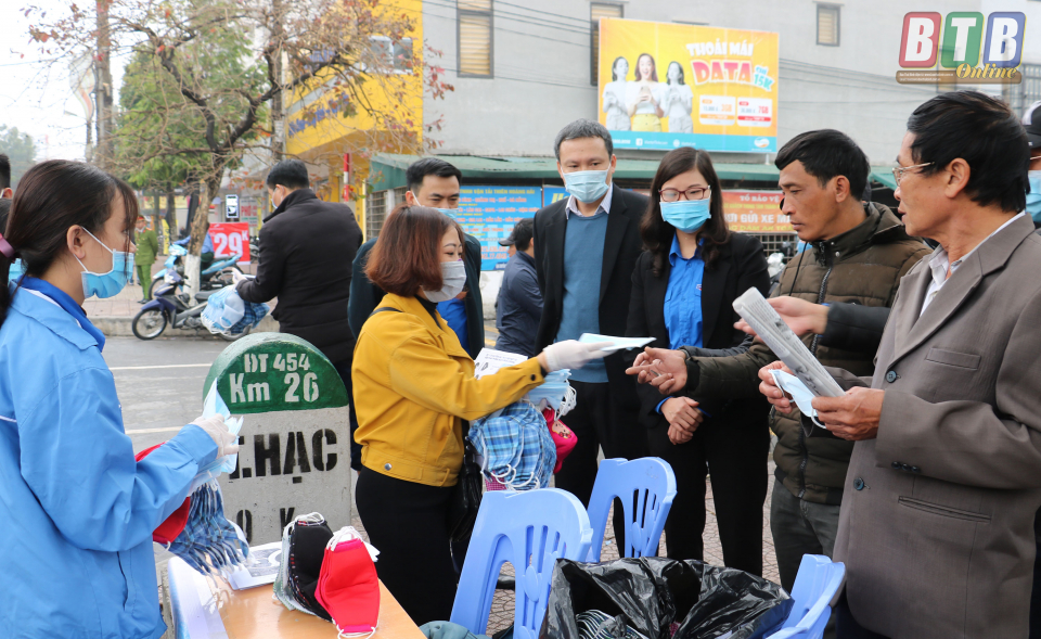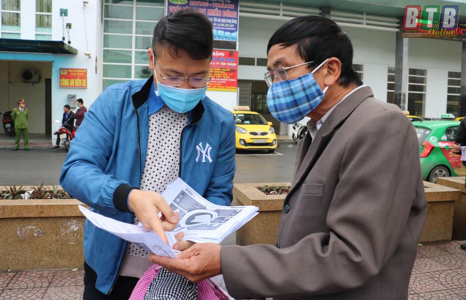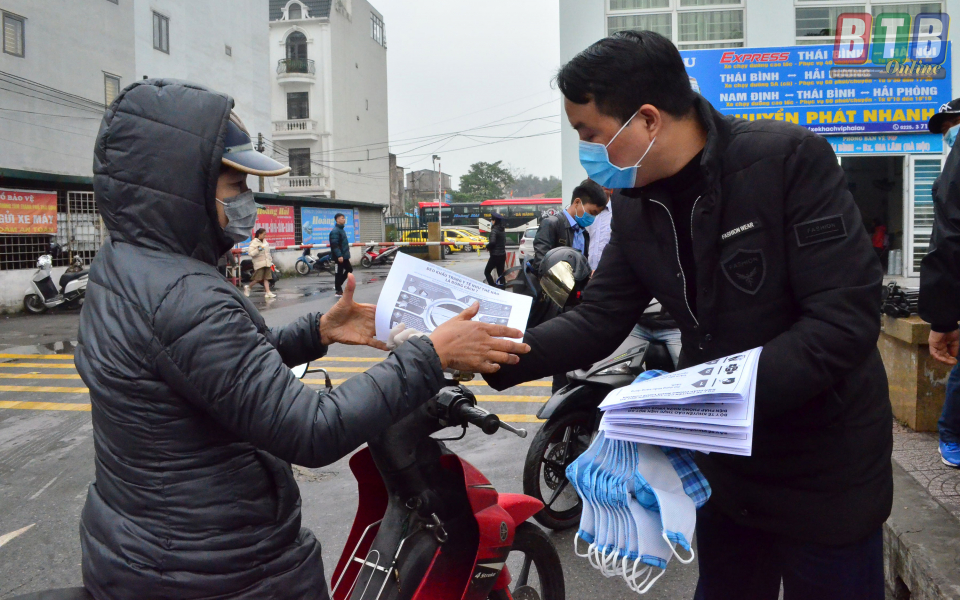 Phát khẩu trang miễn phí và tờ rơi tuyên truyền phòng chống virus corona tại Bến xe Thành phố Thái Bình.