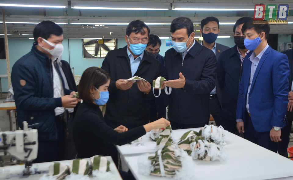 Đây là những doanh nghiệp được UBND tỉnh giao sản xuất khẩu trang phục vụ phòng chống dịch bệnh. Tại các doanh nghiệp, sau khi nghe báo cáo về công tác phòng chống dịch, đồng chí Phó Bí thư Tỉnh ủy, Chủ tịch UBND tỉnh ghi nhận và đánh giá cao công tác phòng chống dịch bệnh, trong đó các doanh nghiệp đã chủ động phát khẩu trang, bố trí nước rửa tay, xà phòng, máy đo thân nhiệt cho công nhân và phun thuốc khử trùng tại nơi làm việc, nhà ăn; tổ chức kiểm tra sức khỏe thường xuyên cho người lao động nước ngoài. Đồng chí Phó Bí thư Tỉnh ủy, Chủ tịch UBND tỉnh cũng đánh giá cao sự vào cuộc tích cực của các doanh nghiệp trong việc đẩy mạnh tiến độ sản xuất tại các doanh nghiệp, đặc biệt các doanh nghiệp đã hỗ trợ một phần kinh phí trong việc sản xuất khẩu trang.