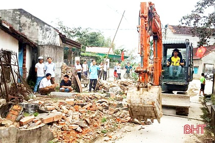 Cán bộ, đảng viên đi đầu tự nguyện tháo dỡ tường rào để mở rộng tuyến đường tại tổ dân phố Ngọc Sơn...